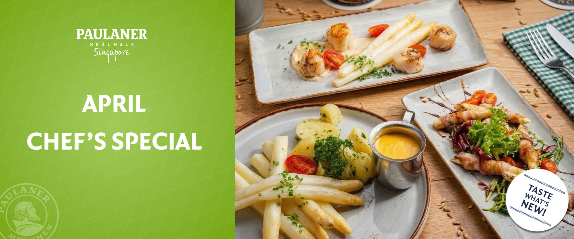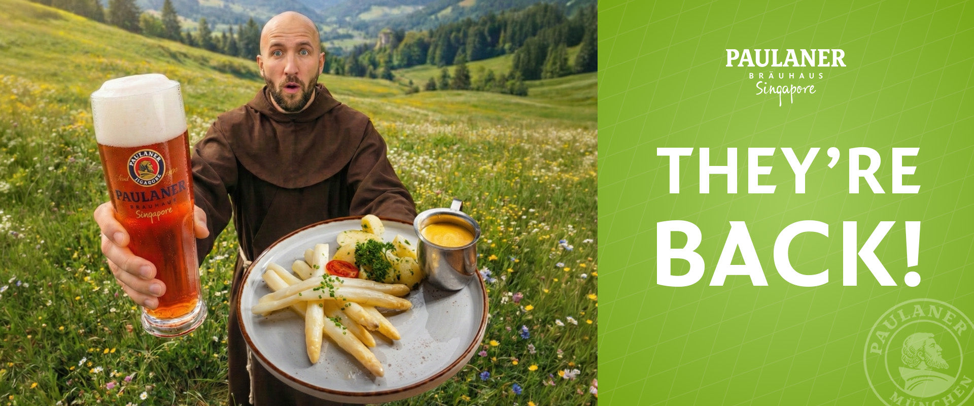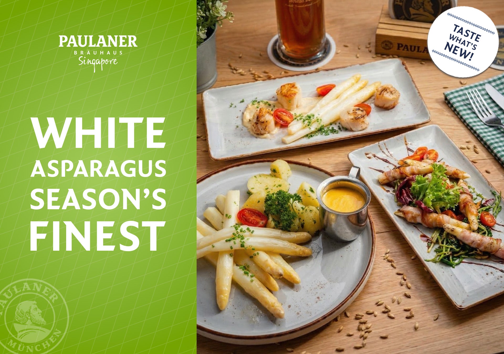 White asparagus has a window, and it's a small one. We're celebrating it properly at Paulaner Bräuhaus Singapore with a dedicated menu that does this rare seasonal justice. Start with a velvety asparagus soup, go classic with Paulaner's beer Hollandaise, or make a night of it with pan-seared scallops, tagliatelle with Serrano ham, and a sharing platter for the whole table. Catch it while it's here.