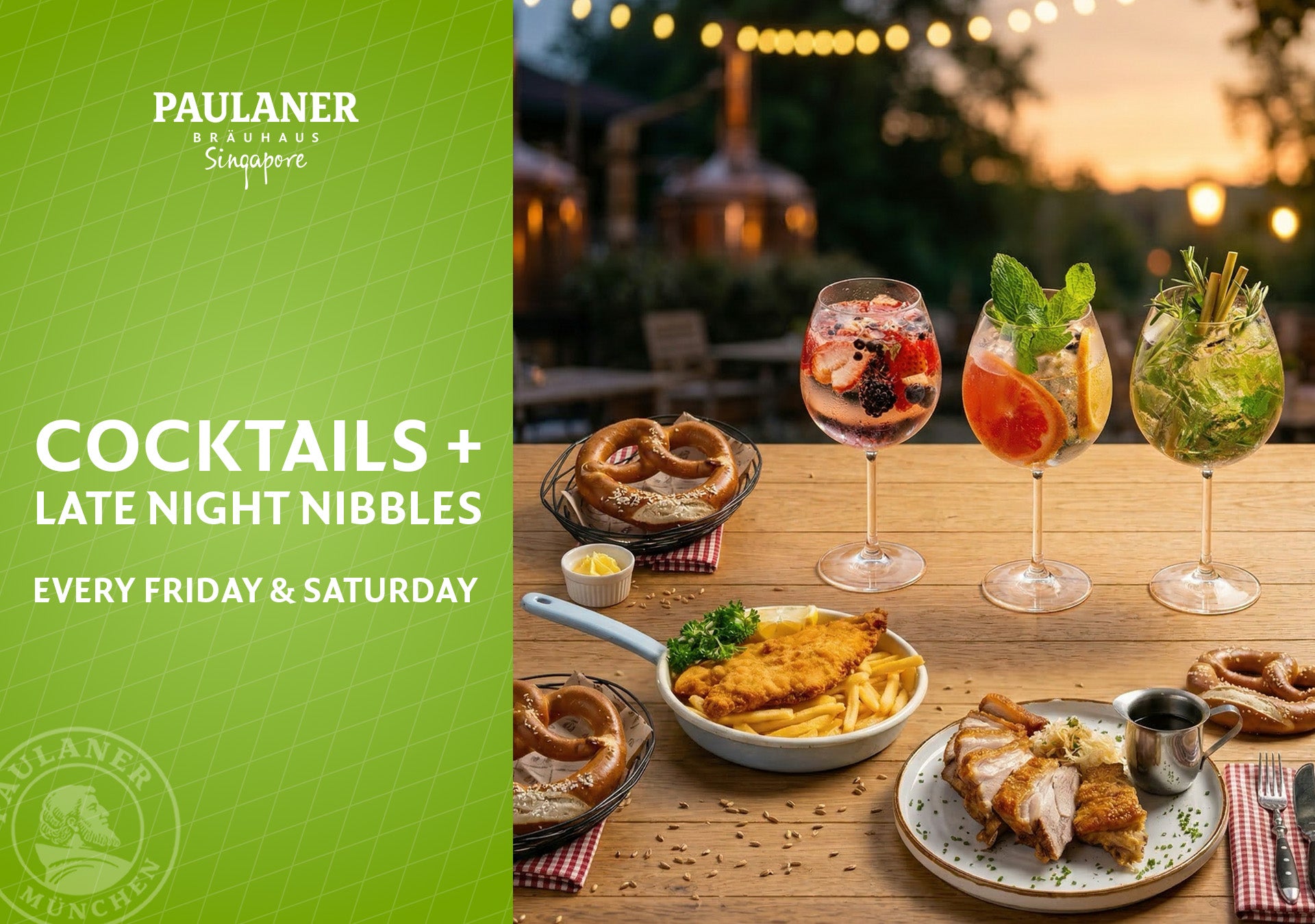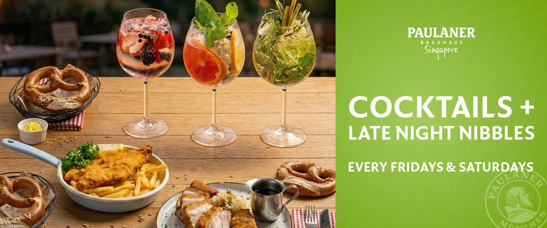 The night is still young. Every Friday and Saturday, Paulaner Bräuhaus Singapore keeps the good times going with handcrafted cocktails and a spread of late night nibbles to share.