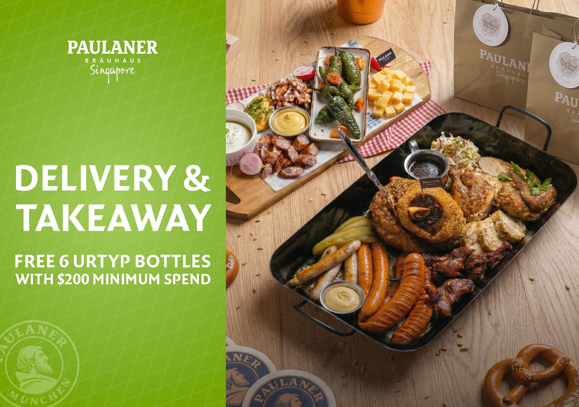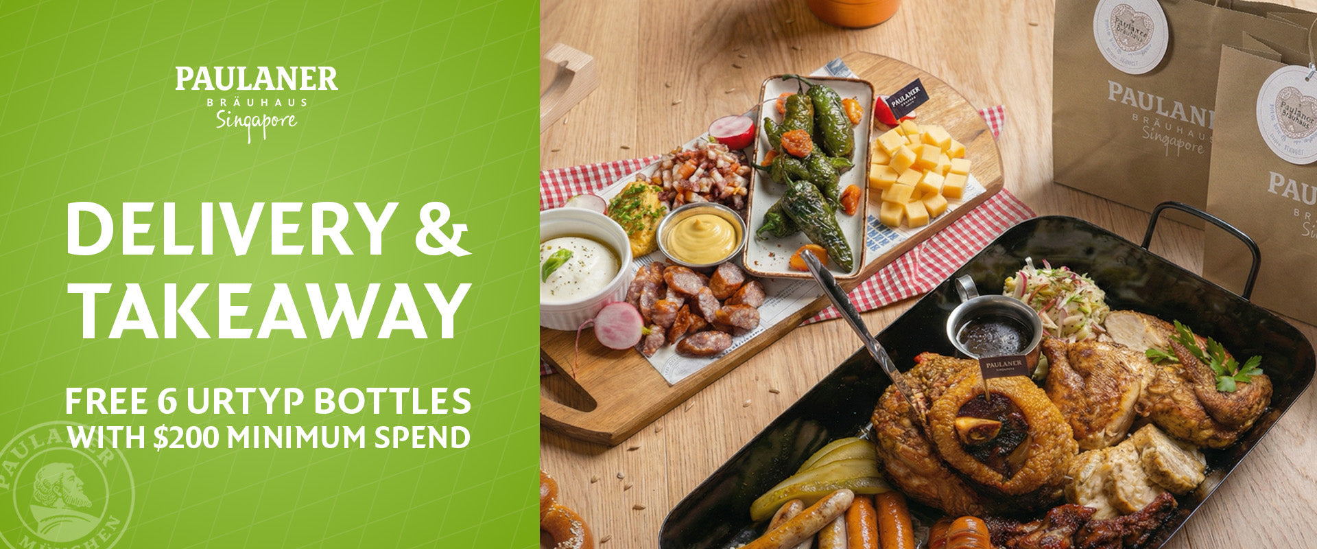 Enjoy your Paulaner Bräuhaus Singapore favourites from the comfort of home. From hearty classics to familiar flavours you love, delivery is quick, easy, and just as satisfying. Enjoy 6 Urtyp bottles for free on your next delivery or takeaway with a minimum spend of $200. Because good food should taste even better when it comes with savings.