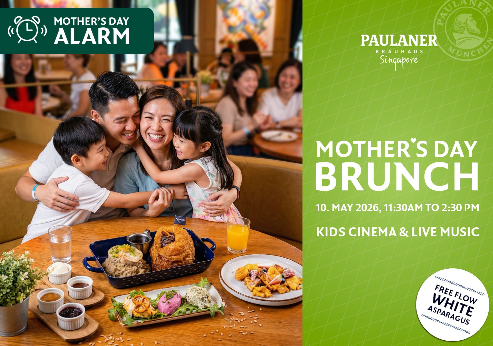 Make Mum's day truly special with an indulgent Mother's Day Brunch at Paulaner Bräuhaus Singapore. Gather the whole family on 10 May 2026, from 11:30am to 2:30pm, for a generous spread of brunch favourites, free-flow white asparagus, live music, and a kids' cinema to keep the little ones entertained. Seats are limited. Book yours now!